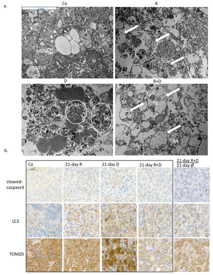 The in vivo effects of long-term rapamycin and doxycycline treatment in ZR75.1-derived xenografts. (a) 3-week-treated tumour xenografts were processed for transmission electron microscopy. Intact mitochondria were presented in untreated tumour sections, the number of autophagosomes was increased after Rapamune treatment; accompanied, and damaged mitochondria could be observed in doxycycline-treated samples. After administrating combined Rapamune and doxycycline treatment, collapsed mitochondria appeared in autophagic vacuoles. Mitochondria (M; clamped mitochondria were framed with white ellipsoids), autophagic vacuoles (arrow); nucleus (N); multivesicular bodies (MVB). (magnification: 20,000×). (b) Immunohistochemistry staining for analysing the expression of cleaved caspase-3 (apoptosis marker), LC3 (both LC3-B-I and II autophagosome proteins) and TOM20 (mitochondrial marker) in ZR75.1 xenografts. Treatments were administered for 21 days; after 21-day therapy, the drug withdrawal was also tested for an additional 21 days (). Images show representative immunostainings. DAB substrate was used for developing immunoreaction (brown), and specimens were counterstained with haematoxylin. Scale bar in the first photo—labels 50 µm. (Co—control; R—Rapamune 3 mg/kg; D—doxycycline 5 mg/kg; R+D—Rapamune + doxycycline combination; Ø no treatment).
