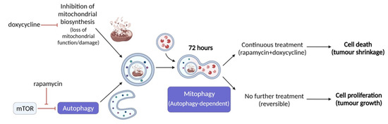 Rapamycin + doxycycline induced autophagy-dependent mitophagy in ZR75.1 breast carcinoma cells. The schematic overview illustrates the mechanism of action of rapamycin + doxycycline combination treatment. Based on our results, rapamycin + doxycycline treatment induces autophagy and consequent fusion of autophagosomes and mitochondria after 72-h treatment in vitro indicating mitophagy and autolysomal degradation. Additionally, tumour shrinkage could also be observed during a 3-week period of continuous treatment in vivo, while treatment withdrawal could lead to the recovery of cell proliferation and tumour growth.