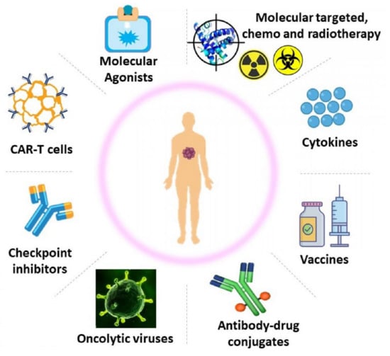 A variety of cancer immunotherapy strategies have been found to be beneficial. Figure 1 depicts the diverse immunotherapies used in the management of cancer [,]. A variety of monoclonal antibody drugs have demonstrated substantial anticancer activity in disorders such as malignant melanoma, renal cell carcinoma, Hodgkin’s lymphoma, non–small-cell lung cancer, breast cancer, bladder cancer, and colorectal cancer. Immune checkpoint blockage or immune checkpoint antibody inhibitors prevent immune checkpoint ligands from binding to receptors, allowing T cells to target antigen-expressing tumor cells. Vaccinations are given to patients to develop innate immunity towards current or newly discovered tumor antigens []. Several adoptive cell transition experiments have also shown that T cells have a powerful ability to eliminate developing tumors, either directly by CTL activity or indirectly by a variety of CD-4 T cell dependent effector pathways []. A number of these strategies activate the immune system in a broad manner, whereas others have a more focused effect. Certain immunotherapies are “customized” via genetic engineering, whereas others, such as monoclonal antibodies, are widely accessible economically []. A more in-depth overview of recent cancer immunotherapy techniques is presented here.