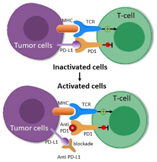 The PD-1 receptor is present on active CD8+ T cells, and when it interacts with its PDL-1 or PDL-2 ligands, it inhibits T cell activation []. PDL-1 receptors are continuously expressed on the cancer cells’ surface via poorly recognized oncogenic signaling pathways, or they can also be released in response to immune-stimulating cytokines such as interferon-α []. PDL-1 expression in response to cytokines is referred to as “adaptive immune resistance”. An antibody that attaches to either PD-1 or PDL-1 disrupts the inhibitory connection and restores T cells’ ability to target tumors (Figure 2) []. Clinical trials have shown that PD-1/PDL-1 inhibitors are beneficial in treating melanoma, Hodgkin disease, NSCLC, and bladder cancer [].