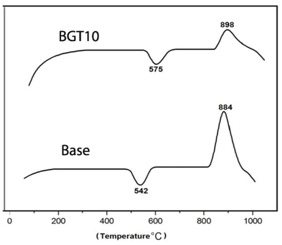 Differential thermal analysis curve of BGT10 with reference to that of native glass (Base).