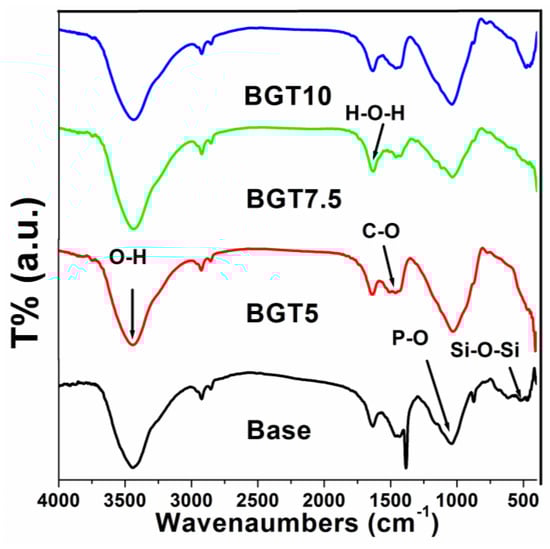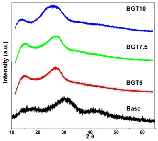 The amorphous nature of the prepared glass samples before and after doping with Ti was confirmed based on the XRD curves presented in Figure 2. It is obvious that the inclusion of TiO2 within the glass network did not alter the physical nature of these samples, as all of them exhibited amorphous curves. However, the presence and quantity of TiO2 were associated with notable changes in the position of the glassy hump region. The base system showed a hump in the region of 25–35 2θ, BGT5 had its main hump in the range of 22–30 2θ, BGT7.5 exhibited a hump in the region of 10–25 2θ, and BGT10 showed a main hump in the range of 18–32 2θ. Same results have been reported for the inclusion of different transition metals in several studies; however, in most of these studies, no remarkable changes were observed in the amorphous nature of glass [,,].
