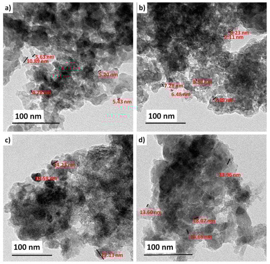 The morphology and size of the dispersed native BG, as well as of the TiO2-doped ones, were captured by TEM, and the images are illustrated in Figure 4. Generally, the obtained pure glass (BGT0) particles were found to be on the nanoscale (4–5 nm) (Figure 4a). Furthermore, relative gradual increases in the particle sizes were noted with increasing TiO2 content in the 7–28 nm range (Figure 4b–d). Titanium is expected to play different roles in the glass formation process; the first scenario is that it acts as a network modifier, which is not very common at higher concentrations, as in the present case. The best scenario would be that Ti acts as a network former, resulting in double condensation, which in turn increases the particle size [,,,]. However, the morphology of the obtained BGs before and after the inclusion of Ti showed an agglomerated appearance, typical of BG nanoparticles [,].