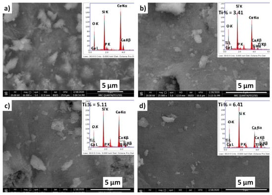 The bulk morphology and elemental composition of BGT s were recorded using a SEM-EDAX instrument, the results of which are shown in Figure 5. All the prepared samples exhibited very amorphous surfaces composed of very fine particles; no particlefusion was detected in the micrographs, which suggests the absence of crystallised nanoparticles. This result is in agreement with the XRD results and confirms the amorphous nature of the obtained glasses. Moreover, the elemental composition of the native glass was confirmed by its corresponding energy-dispersive X-ray spectroscopy (EDAX) chart; the observed elements were Ca, Si and P, which matched the main components of the hypothesised system. In addition, the inclusion of TiO2 in the glass network was confirmed, and its measured content was relatively close to the hypothesised one. Recently, the presence of inorganic elements in biomaterials has been correlated with in vitro uptake of water and the final biocompatibility features of biomaterials in several studies [,,]. It is believed that the capacity of biomaterials to absorb water, which is associated with their expanding capacity, is pivotal for the stability of the biomaterial structure and transportation of cell supplements and metabolites present in biomaterial substrates.