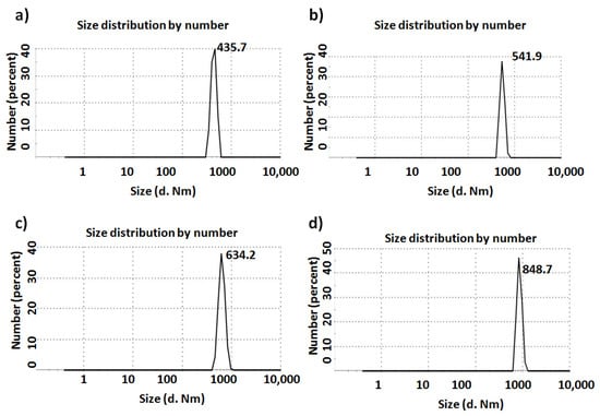 Particle size of (a) BGT0, (b) BGT5, (c) BGT7.5 and (d) BGT10 determined by Zetasizer.