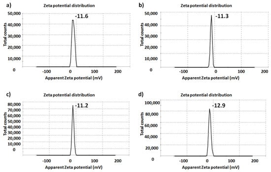 Particlesurface charges of (a) Base, (b) BGT5, (c) BGT7.5 and (d) BGT10 determined by Zetasizer.