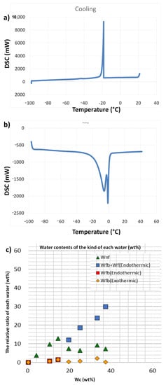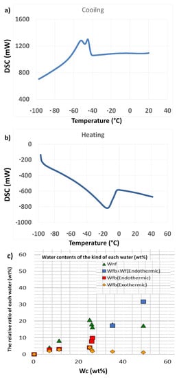 Water content of BGT10 sample determined by differential scanning calorimetry under (a) cooling and (b) heating conditions; (c) water content of each type of water (Wnf = non-freezing water; Wfb = freezing bound water, and Wf = freezing water).