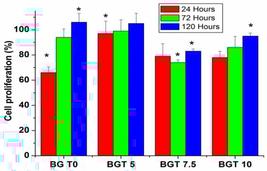 The mode of death in MG63 cells exposed to each glass sample for different time intervals (24, 72 and 120 h) was evaluated. The cell proliferation (%) is shown in Figure 10. Notably, after 24 hexposure, the viable cell count decreased to 63–78% compared to that of normal cells for all the samples except for BGT5, which showed a very little decrease (97%).The percentage of cells undergoing necrosis was minimal (6–16%) compared to that of apoptosing cells (16–21%). Vital (green), early apoptotic (bright green to yellow), late apoptotic (orange), and necrotic (red) cells very observed. This suggests a lower death rate caused by BGT samples. The BGT5 sample maintained cell viability at 72 (99%) and 120 h (109%). For the other glass samples, the cell viability increased as the exposure time increased, and they demonstrated decreased percentages of necrotic cell death (2–10%) and stable percentages of apoptic death (14–20%). This could be explained by the fact that the cells surviving after 24 h adapted to the glass environment and continued to proliferate under the new conditions. These results were confirmed by images recorded after 24 and 72 h (Figure 11).