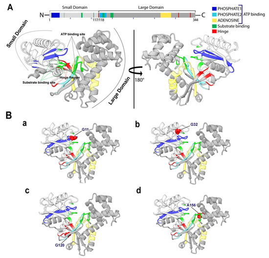 Molecular architecture in human NAGK crystal structure. (A) Representative three-dimensional structure highlighting the structural domains and motifs present in NAGK. (B) Cartoon representation labeled with identified variant position for G11R (a), G32R (b), G120E (c), and A156D (d).