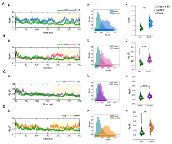 Analysis of radius of gyration deducing the changes in the NAGK conformational stabilities. Rg value of G11R (A), G32R (B), G120E (C), and A156D (D) variants versus wild-type NAGK, where in all cases, (a) represents time-dependent changes during the simulation, while (b) and (c) describe probability density and mean difference in the Rg distribution, based on the last 125 ns trajectories. The annotations used in A(c), B(c), C(c), and D(c) represent statistical significance, denoting *** p < 0.0001. Two-tailed, equal-sample variance Student’s t-tests were used to calculate the p values.