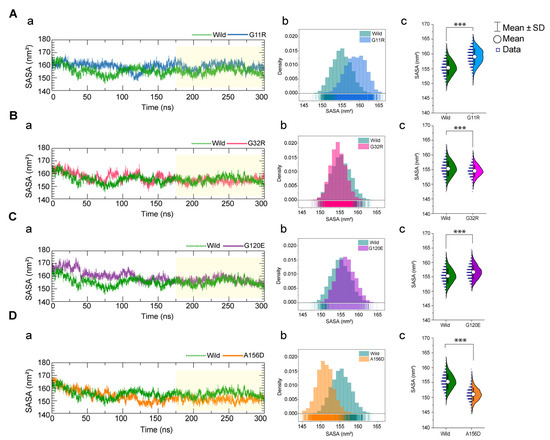 Since the RMSD and Rg analysis indicated substantial structural changes in variant type structures, the total solvent accessible surface area (SASA) of all variants was calculated and compared with wild-type. The SASA indicates solvent accessibility, where a decrease in SASA describes the shrunken structure. At the same time, a high value denotes protein flexibility suggesting that the hydrophobic core of the protein appeared to be exposed in the aqueous surrounding due to the loss of hydrophobic interactions among nonpolar residue clusters [28]. As shown in Figure 4A,C, both G11R and G120E induced total SASA of the protein than the wild-type, and G11R showed higher deviation than the G120E. The SASA distribution of G11R shifted to the right than the wild-type and showed a high distribution between 160 to 163 nm2 (Figure 4A(b)). G120E represented high distribution in the range of 156 to 157 nm2, whereas the wild-type had a high distribution ranging from 156 to 158 nm2 (Figure 4C(b)). Conversely, A156D and G32R showed a reduced SASA value compared to the wild-type, in which A156D had a high distribution around 150 nm2 (Figure 4D(b)), while G32R raised SASA around 154 nm2 (Figure 4B(b)). The SASA analysis, together with RMSD and Rg calculations, thus summarizes that these variants caused the changes in overall protein dimension, which might lead to misfolded protein conformation and thus affect protein–protein interactions.