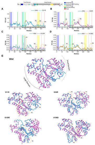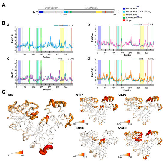 Similarly, N36 showed a high fluctuation in the case of A156D and other residues (H37 to I40), along with high fluctuations in G11R and G32R compared to the wild-type (Figure 5B(a,b)). The ATP binding site, containing conserved motifs such as ADENOSINE (residues, V269 to L275), was seen to have more fluctuation in A156D and G11R than the wild-type. In addition, residues in the region L250 to V269 and S275 to S300 showed reduced fluctuations in G120E and G32R. The residual fluctuations in the PHOSPHATE2 motif also deviated more in G120E and A156D; however, residual fluctuations in the hinge region remained unaffected. Additionally, G120E and A156D showed high RMSF values (Figure 5C,D) in the residues of D79 to R85 near the substrate binding site (S76 to D79).