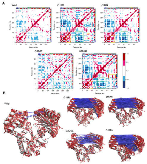 Again, to expose the changes in protein dynamics, we conducted principal component analysis (PCA), representing most of the dominant motions during the simulations [17,29]. Remarkably, all variants were found to have more variances than that of the wild-type, such as G11R, G32R, G120E, and A156D with variances of 60.9%, 53.9%, 53.9%, and 58.8%, respectively, in the first three PCs, whereas wild-type has a variance of 43.2%. All variants also produced different patterns in the directional movement of NAGK, as highlighted by root mean square inner product (RMSIP) analysis (Figure S3, Supplementary File 2), that predict similarities between the subspaces of wild-type and variants trajectories by comparing covariance matrices. A perfect similarity is indicated by RMSIP value 1, while 0 means the similarities between the matrices are orthogonal. When compared to the wild-type, all variants showed a minimal RMSIP value, lower than 0.5, which suggests that structural dynamics between the wild-type and variants are hardly identical, meaning that variants induced a loss of cumulative movements [30,31].