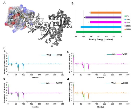 Our previous report evidenced the physical interaction of NAGK in the dynein complex, where it interacts with DYNLRB1 by its small domain and promotes dynein-mediated functions [11,13,14,34]. To analyze the effect of identified NAGK variants in dynein association (Figure 8A), we analyze the binding energy between NAGK and DYNLRB1in both wild-type and variants (Figure 8B). Resultantly, all variants showed a reduction in the binding energy of the NAGK-DYNLRB1 complex as a result of the amino acid change (Table S4, Supplementary File 2). The binding energy variation between wild-type and variants was calculated, which represents that binding energy between these two proteins is reduced to >8% in all variants (Figure 8B). Among all the variants, A156D and G32R highly decreased the binding energy to >30%, having a binding energy of −40.86 kcal/mol and −41.21kcal/mol, respectively, whereas the wild-type showed binding energy of −59.45 kcal/mol. On the other hand, G11R and G120E also showed less binding energy than the wild-type, which is −53.97 kcal/mol and −47.36 kcal/mol, respectively. Figure 8C represents the deleterious effect of variants in protein–protein interaction, which showed that variants reduced the total binding free energy contributed by hot-spots, especially K59AGVDPLVPLR69 [13,14]. In wild-type, the R69 residue showed total contributing binding energy of −5.58 kcal/mol, which, however, reduced in G11R, G32R, G120E, and A156D to −2.17, 0.34, 0.72, and −1.86 kcal/mol, respectively (Figure 8C).