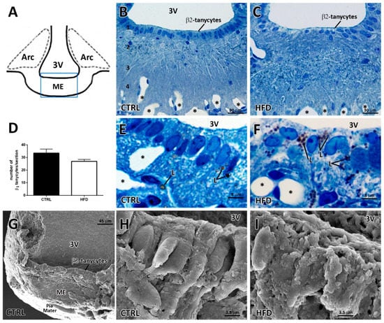 Morphological aspects of the median eminence from normo-fed controls (CTRL) and high-fat diet (HFD) mice. (A): Schematic picture of a coronal section of mouse hypothalamus, showing the studied area (squared). (B,C): Light microscopy of toluidine blue-stained hypothalamic coronal semithin sections from a CTRL (B) and a HFD (C) mouse. The CTRL median eminence (ME), from the ventricular to the pial surface, shows a layered organization: an ependymal layer of β2-tanycytes (1); an underlying space mostly containing neuronal and glial somata (2); a palisade region of tanycytes processes (3); fenestrated capillaries (4) (capillaries: asterisks). In the HFD mouse (C), the layered organization is still present, but β2-tanycytes display disorganized nuclei and less-stained cytoplasm. (D): Number of β2-tanycytes/section in CTRL and HFD mice. Data (n = 3 mice for each condition) are reported as mean ± standard error (p < 0.05 by unpaired student’s t-test). (E,F): High magnification of the β2-tanycyte layer in semithin sections from CTRL and HFD mice, respectively. L, lipid droplets; *, capillaries. (G): Scanning electron microscopy image of the ME at low magnification from a CTRL mouse. (H,I): Scanning electron microscopy images of β2-tanycytes in a CTRL and a HFD mouse, respectively. 3V, third ventricle; Arc, arcuate nucleus.
