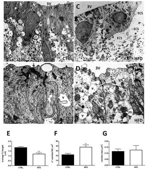 Based on the light microscopy results, the ultrastructural investigation was mainly focused on the β2-tanycyte layer. In CTRL mice, tanycytes forming the ependymal layer exhibited elongated and often-indented nuclei as well as an electron-dense and well-differentiated cytoplasm, rich of numerous organelles (Figure 2A,B). The space beneath the ependymal layer contained axons, dendrites, and tanycyte projections and spared neuronal and glial cell bodies (Figure 2A). At their latero-apical surface, β2-tanycytes were joined by evident junctions, whose extension was increased by membrane infoldings facing opposing membrane irregularities of the adjacent cell (Figure 2B). In HFD mice, a consistent proportion (about 30% ± 7, n = 3) of β2-tanycytes appeared deeply altered. These ependymal cells exhibited roundish nuclei and displayed abnormal enlargements of the extracellular space (Figure 2C). The underlying subependymal layer showed large vacuoles and empty spaces, while the neuropil structures seemed to be weakly packed (Figure 2C). These aspects, namely vacuolization and large extracellular spaces, were suggestive of subependymal oedema [,], which is a histopathological condition frequently found in hydrocephalus and linked to reduced or degenerated cellular junctions. Interestingly, in HFD mice, tanycytic lateral membranes exhibited reduced infoldings and junctions’ shorter extension (Figure 2D). This qualitative observation was confirmed by morphometric analysis: the length of the portion occupied by tight junctions was significantly lower in HFD mice compared to CTRL (tight junctions’ length in µm in CTRL vs. HFD: 1.86 ± 0.10 vs. 1.20 ± 0.12, p < 0.05, Figure 2E). Moreover, morphometric analysis confirmed a higher density of cytoplasmic vesicles in HFD β2-tanycytes compared with CTRL (number of vesicles in 100 µm2 in CTRL vs. HFD: 22.17 ± 3.73 vs. 37.82 ± 1.87, p < 0.05, Figure 2F), whereas the mean size of cytoplasmic vesicles was not significantly affected by HFD (average size in µm2 in CTRL vs. HFD: 0.116 ± 0.020 vs. 0.127 ± 0.037, p = 0.78, Figure 2G).