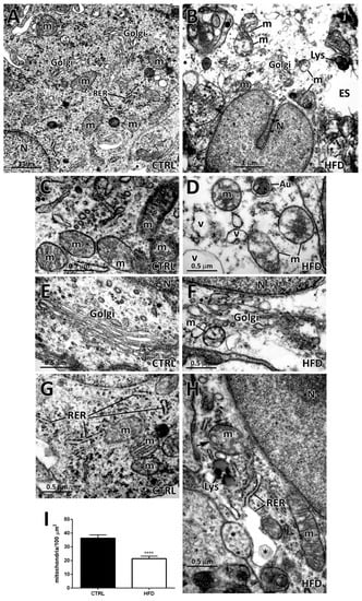 At higher magnification, the perikaryon of β2-tanycytes of CTRL mice displayed typical features of a well-differentiated cell, rich in free ribosomes, large mitochondria, cisternae of rough endoplasmic reticulum (RER), Golgi complex, and differently sized vesicles (Figure 3A) [,,]. Glycogen was present in a small amount, whereas lysosomes and lipid droplets were only occasionally found. In striking contrast, HFD β2-tanycytes were characterized by an electron transparent cytoplasm and by altered/degenerating organelles, numerous vesicles, primary and secondary lysosomes often associated to lipid droplets (Figure 3B). In details, in HFD condition, the mitochondria were very heterogeneous in shape and size, and they presented swellings and internal alterations, including abnormally arranged cristae, absence of cristae in distinctive areas and, sometimes, the presence of myelin-like structures (compare Figure 3D,H with Figure 3C). These mitochondria resembled the swollen or hydropic mitochondria that are frequently found when an uncontrolled entry of water (or solutes) occurs in the cell []. This cellular event is characterized by progressive changes in mitochondrial morphology: they first enlarge, the cristae disappear, and lastly, the organelle appears empty. Degenerating mitochondria usually undergo mitophagy, which is a strategy adopted to clear the damaged organelle []. In HFD β2-tanycytes, hydropic-like mitochondria were often found in close proximity to lysosomes and autophagosomes, which are both frequently detected in these cells (Figure 3D,H). Accordingly, the density of mitochondria in HFD β2-tanycytes was significantly lower compared to CTRL (number of mitochondria in 100 µm2 in CTRL vs. HFD: 36.32 ± 2.39 vs. 21.43 ± 1.79, p < 0.05, Figure 3I).