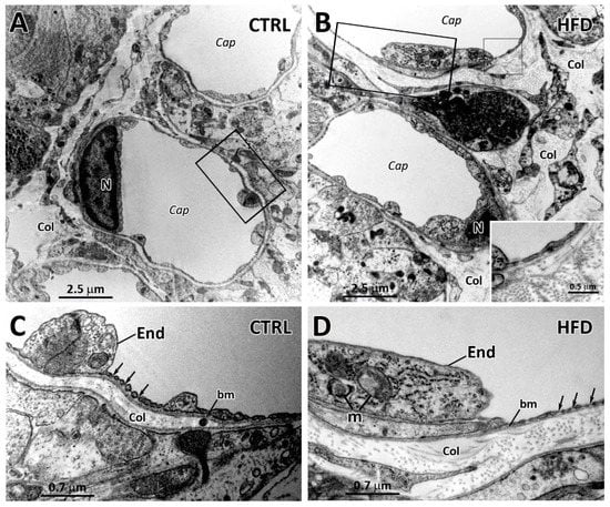 Transmission electron microscopy of capillaries located in the external portion of the median eminence from normo-fed controls (CTRL) and high-fat diet (HFD) mice. (A,B): Low magnification of median eminence capillaries (Cap) from a CTRL (A) and a HFD mouse (B). In (A), few collagen fibrils (Col) are visible in the perivascular space, whereas in (B) higher presence of perivascular collagen fibrils (Col) is visible. The inset of (B) is the enlargement of the smaller area framed in (B) and shows collagen fibrils at higher magnification. (C,D): Higher magnifications of the areas framed in (A,B), respectively, showing fenestrated walls of the capillaries (arrows) and collagen fibrils (Col) distributed in the perivascular spaces, below the basal membranes (bm) of endothelial cells (End). In (D), degenerating mitochondria (m) in the cytoplasm of an endothelial cell are also visible. N, nucleus.