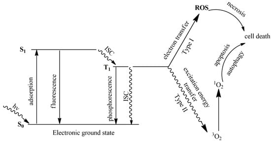 Modified Jabłonski’s diagram illustrating the principle of photodynamic therapy (ROS = reactive oxygen species). (cf to text for explanation). Adapted from [45] with permission from Acc. Chem. Res., Copyright ACS 2017.