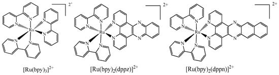 Chemical structure of [Ru(bpy)3]2+ (bpy = 2,2′-bipyridine), [Ru(bpy)2(dppz)]2+ (dppz = dipyrido[3,2-a:2′,3′c]phenazine) and [Ru(bpy)2(dppn)]2+ (dppn = benzo[i]dipyrido[3,2-a:2′,3′-c]phenazine). Adapted from [48] with permission from the journal Chem. Sci., Copyright 2015.