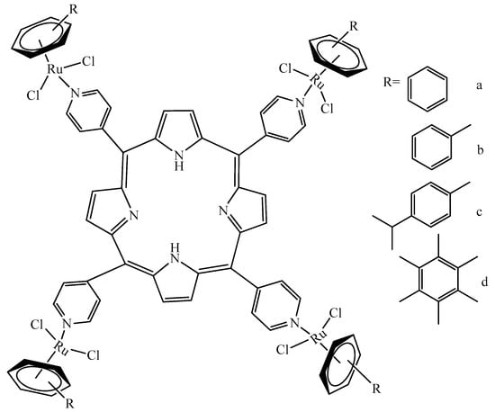 Recently, scientists have achieved high anti-cancer effects by modifying the porphyrin structure with benzene groups and its derivatives. The research group led by Therrien added several Ru(II)-based arene fragments to the meso-4′-tetrapyridylpyrin scaffold to assess the impact of aromatic moieties (Figure 3). They showed that all the compounds listed below showed 60–80% cytotoxicity on human Me300 melanoma cells. The studies have been carried out at a wavelength of 652 nm (to ensure the deepest possible penetration of cancer cells) and a concentration of 10 μM and a fluence at 5 J·cm−1 (at 488 nm, power of 50 mW).