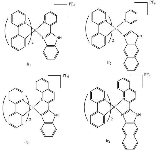 Chemical structures of complexes Ir1–Ir4. Adapted from [55] with permission from the journal ACS Appl. Mater. Interfaces, Copyright 2017 American Chemical Society.