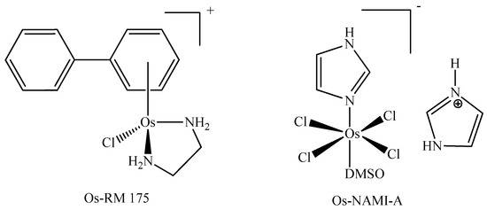 Chemical structures of the complexes Os-RM175 and Os-NAMI-A (DMSO = dimethyl sulfoxide). Adapted from [62] with permission from the journal RSC Adv., Copyright © 2019.