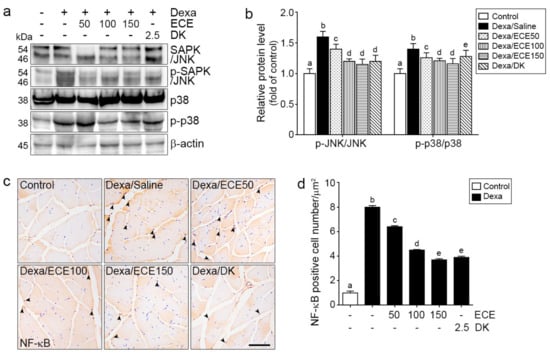 2.2. ECE and DK Decreased JNK/p38 Activity and NF-κB Expression