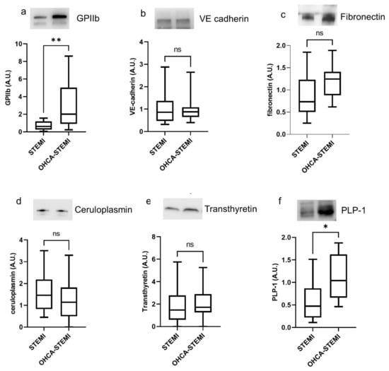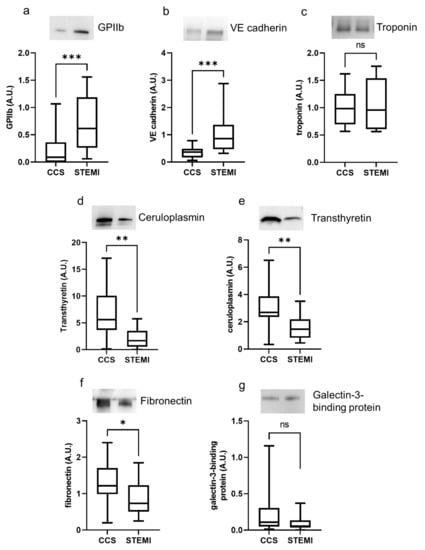 - Gidlöf, O.; Evander, M.; Rezeli, M.; Marko-Varga, G.; Laurell, T.; Erlinge, D. Proteomic profiling of extracellular vesicles reveals additional diagnostic biomarkers for myocardial infarction compared to plasma alone. Sci. Rep. 2019, 9, 8991. [Google Scholar] [CrossRef] [PubMed] [Green Version]
