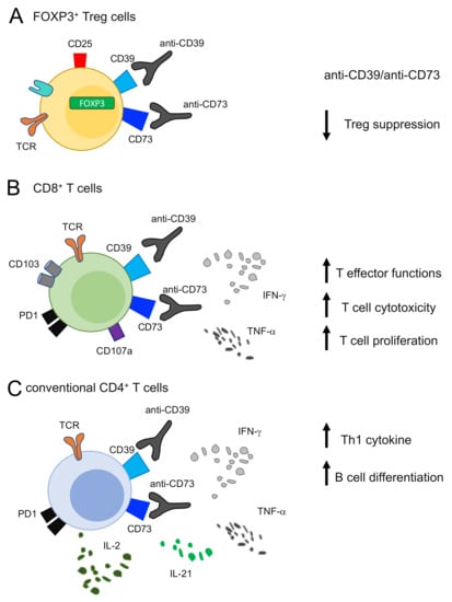 Effects of targeting CD39 on T cells. (A) CD39 or CD73 blocking by pharmacological compounds (i.e., POM1 and ARL7156 or small-molecule inhibitors) or by using antibodies in in vivo systems decreases the suppressive activities of FOXP3+ Treg cells. (B) Targeting CD39 or CD73 in CD8 T cells effects an increase in effector and cytotoxic T cell functions, mediated by IFN-γ and TNF-α production and CD107a upregulation. (C) Targeting CD39 or CD73 in CD4 T cells increases Th1 cytokine (IFN-γ, TNF-α and IL-2) and IL-21 production, which (was recently found to be) is responsible for B cell differentiation.
