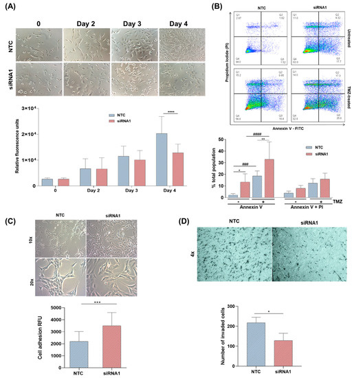 2.4. LOXL3 Downregulation in U87MG Cells Decreased Viability and Invasion, Induced Death, and Increased Adhesion