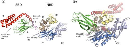 In general, HSP70s consist of an N-terminal nucleotide-binding domain (NBD) and a C-terminal substrate-binding domain (SBD) connected by a flexible and highly conserved hydrophobic linker, which is crucial for allosteric inter-domain communication (review in [81]). The NBD domain is formed of four subdomains (Ia, IIa, Ib and IIb), organized into two lobes separated by a deep cleft, where the ATPase catalytic site resides (Figure 1a). In E. coli, the Ia NBD subdomain functions as a key mediator of inter-domain allostery, representing a signal transduction between the binding sites for ATP and substrate [104]. The SBD domain is capable of binding extended polypeptides rich in aliphatic residues and is composed of two parts, a β-sandwich subdomain (SBDβ) with the binding site and an α-helical subdomain (SBDα) acting as its flexible lid [81,94,105,106,107]. Both domains, NBD and SBD, are linked by a flexible linker that transfers the structural re-arrangements caused by the ATP hydrolysis from NBD to the SBD, which enables folding of the client protein [81].