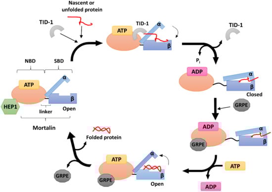 A likely model of the human mitochondrial HSP70 (mortalin) reaction cycle. Mortalin is composed of a nucleotide binding domain (NBD) and a substrate binding domain (SBD), which is divided into β and α sub-domains. The function of mortalin is tightly regulated by three co-chaperones, HEP1, TID-1 and either isoform of GRPEL1/2. HEP1 protects mortalin against self-aggregation and controls its ATPase activity. In the ATP-bound state, mortalin is in an open conformation and the flexible linker (located between the NBD and SBD) binds closer to the NBD. TID-1, which binds directly to mortalin, stimulates its ATPase activity, and prevents substrate protein aggregation. Substrate binding to the mortalin SBD binding cavity induces ATP hydrolysis and mortalin shifts into a closed conformation. GRPEL1/2 subsequently assists in the exchange of ADP for ATP. After ATP binding, mortalin returns into the open conformation and a folded substrate is released.