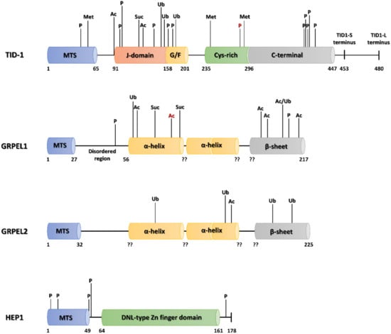 TID-1 (tumorous imaginal disc protein 1), also known as DnaJ homolog subfamily A member 3 (DnaJA3), is a small mitochondrial protein belonging to the HSP40 sub-family. TID-1 is a human homologue of the bacterial protein DnaJ and the tumor suppressor protein TID-56 present in Drosophila [189,190]. Its translation occurs in the cytosol, and mRNA splicing produces two isoforms: a 43 kDa long isoform called TID-1L, and a shorter 40 kDa isoform called TID-1S. These isoforms differ in the length of their C-terminal ends (33 residues for TID-1L and 6 for TID-1S) [191,192]. NMR studies have shown that TID-1 contains a highly conserved J-domain at its N-terminus, typical for all DnaJ proteins, which is extremely important for its binding to mtHSP70 [193,194,195]. The J-domain contains approximately 70 amino acids and forms 4 α-helices with a characteristic conserved region, the HPD motif, located between the second and third α-helices. This region is responsible for both its binding to and stimulation of the mtHSP70 ATPase domain [196]. Adjacent to the J-domain, TID-1 possesses a G/F-rich region and a cysteine-rich region characterized by four repeats of a conserved CXXCXGXG motif with two coordinated zinc ions [197,198].