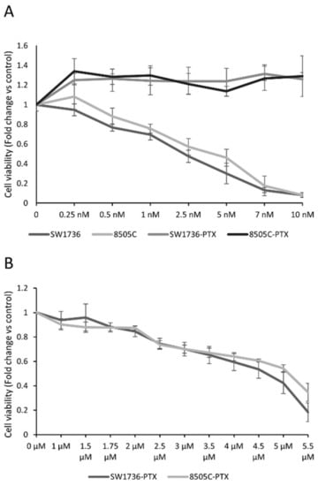 Effects of paclitaxel in ATC cell line cell viability. (A) SW1736 and 8505C parental and paclitaxel-resistant (SW1736-PTX and 8505C-PTX) cells were treated with paclitaxel at different doses (rising from 0.25 nM to 10 nM) or vehicle (DMSO) for 72 h and cell viability was assessed by MTT assay. (B) SW1736 and 8505C paclitaxel-resistant cells were treated with paclitaxel at different doses (rising from 1 μM to 10 μM) or vehicle (DMSO) for 72 h and cell viability was assessed by MTT assay. Each point represents the mean of six measurements. n = 6. p values are enlisted in Supplementary Tables S1 and S2.