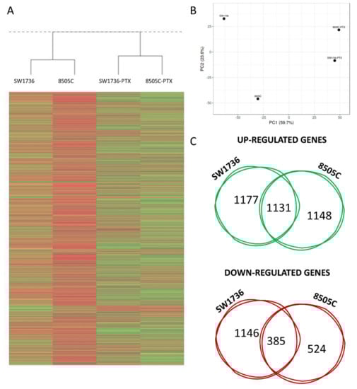 Paclitaxel-resistance effects on gene expression. (A) Heat maps showing the hierarchical clustering of mRNA in SW1736 and 8505C cells and in SW1736-PTX and 8505C-PTX cell lines. Results are showed as Fold Change (Log2). (B) Principal Component Analysis (PCA) results. Each point represents an RNA-Seq sample. Samples with similar gene expression profiles are clustered together. (C) Venn diagrams represented the comparison of up-regulated, down-regulated between SW1736-PTX and 8505C-PTX cell lines after RNA-seq data analysis. Within the intersection of the circles are indicated the shared modified genes between the two cell lines.