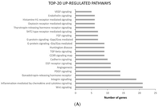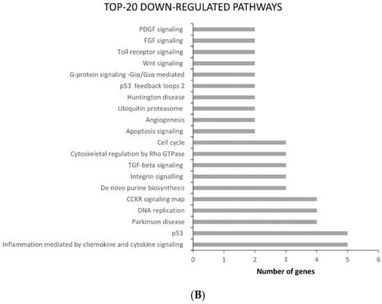 Top 20 deregulated pathways. (A) Top 20 common and up-regulated pathways in SW1736-PTX and 8505C-PTX cells. (B) Top 20 common down-regulated pathways in SW1736-PTX and 8505C-PTX. Pathway analysis was performed using the Panther classification system.