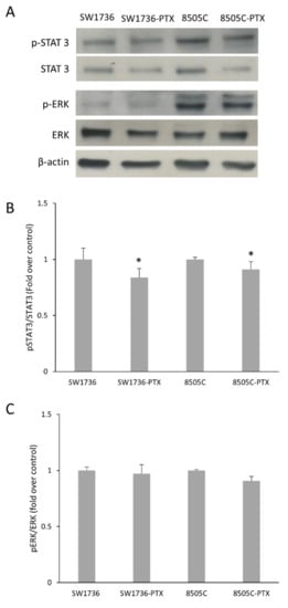 Expression levels of STAT 3 and ERK in wild type and Paclitaxel-resistant ATC cells. (A) Immunoblot analysis of phosphorylated ERK (p-ERK) and phosphorylated STAT 3 (p STAT3), and total form of the enzymes (ERK, STAT3), was performed by Western blotting in parental and Paclitaxel-resistant (-PTX) SW1736 and 8505C cells. β-actin was used as loading control. n = 3. (B) Densitometric analysis of p-ERK/ERK. n = 2. Panel (C) Densitometric analysis of p-STAT3/STAT3. n = 3. Values are expressed as fold over control. Statistical analysis was performed using the Tukey–Kramer multiple comparisons test. * p < 0.05 vs. control.