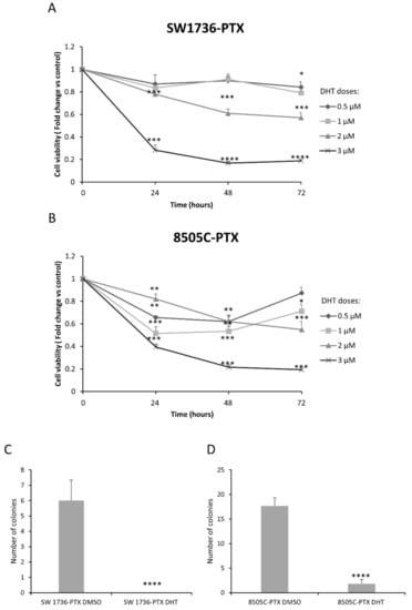 In order to assess the effects of DHT on the viability of PTX-resistant ATC cells, we carried out an MTT assay on SW1736-PTX and 8505C-PTX after treatment with increasing DHT doses for 24, 48 or 72 h. In SW1736-PCTX the two highest doses (2 and 3 µM) reduced cell viability after 24, 48, and 72 h treatment (Figure 5A); conversely, in 8505C cells, all doses tested were able to significantly reduce the cell viability at each time point (Figure 5B). Based on these data, the 2.5 µM dose and 72 h treatment were considered as the common EC50 of the two cell lines and used in the further experiments. To assess the effects of DHT on other characteristics of aggressiveness in the two ATC-PTX cell lines, we assessed its influence on the ability of cells to form colonies in an anchorage-independent way, by performing a soft agar colony formation assay. As shown in Figure 5C,D, there was a significant reduction in the number of colonies when cells were treated with 2.5 µM DHT. In 8505C cells, DHT reduced the number of colonies by approximately 10-fold, and its effects were stronger on SW1736 cells, in which it completely abrogated colony formation ability.