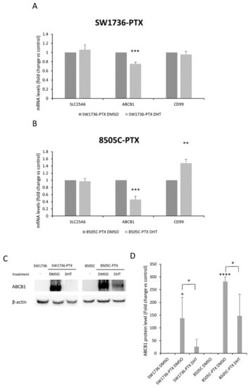 In order to study the molecular mechanisms underlying the effects of DHT in resistant cells, we focused on commonly up-regulated genes. We analyzed the variation in the gene expression levels following the treatment with DHT of commonly up-regulated genes present in the top 10: SLC25A6, ABCB1 and CD99. Among selected commonly up-regulated genes, in SW1736-PTX, DHT induced a significant decrease only in ABCB1 expression after treatment at 2.5 µM concentration for 72 h (Figure 6A). The same effect on ABCB1 was also observed in 8505C-PTX cells, in which treatment with DHT also determined an increase in CD99 expression (Figure 6B).