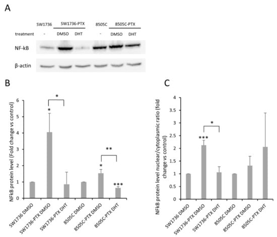 Effects of DHT on NF-κB in ATC and ATC-PTX cells. SW1736 and 8505C cells, both parental and paclitaxel-resistant, were treated with DHT 2.5 μM or vehicle. (A) NF-κB protein levels in ATC and ATC-PTX cells treated with DMSO or 2.5 μM DHT for 72 h. (B) Densitometric analysis of NF-κB protein levels in ATC and ATC-PTX cells treated with 2.5 μM DHT or DMSO. Data are normalized against β-actin levels. (C) Densitometric analysis of NF-KB nuclear/cytoplasmatic protein levels ratio in ATC and ATC-PTX cells treated with 2.5 μM DHT or DMSO. Cytoplasmatic data are normalized against β-actin levels and nuclear data are normalized against Lamin B1. n = 3. * p < 0.05, ** p < 0.01, *** p < 0.001.