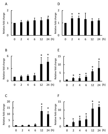 qPCR was performed to observe inflammatory cytokine expression. At 24 h incubation with 10 µg/mL nanotitania, IL-1β mRNA was slightly increased (Figure 1A). At 12 and 24 h incubation with 10 µg/mL nanotitania, IL-6 mRNA was significantly increased (Figure 1B). Similar to IL-6 mRNA expression, IL-8 mRNA was significantly increased at 12 and 24 h incubation with 10 µg/mL nanotitania (Figure 1C). The peak at incubation with 100 µg/mL nanotitania tended to be faster and more intensified than that with 10 µg/mL nanotitania. IL-1β mRNA expression was increased at 2 and 4 h (Figure 1D) and IL-6 and IL-8 mRNA expression continued to significantly increase from 2 to 24 h incubation (Figure 1E,F).