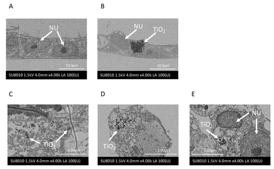 Scanning electron microscopy (SEM) images of Ca9-22 cells. (A) Control, (B) incubation with 100 µg/mL nanotitania for 1 h, (C) incubation with 10 µg/mL nanotitania for 1 h, (D) incubation with 10 µg/mL nanotitania for 12 h, (E) incubation with 10 µg/mL nanotitania for 24 h. NU, nuclear; TiO2, nanotitania.
