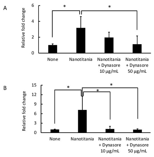 To confirm whether the induction of cytokine expression by nanotitania was due to the uptake of nanotitania, an endocytosis inhibitor (dynasore) was used. The induction of IL-6 mRNA was significantly inhibited by 50 µg/mL dynasore (Figure 3A). Similarly, the induction of IL-8 mRNA was significantly reduced by 50 µg/mL dynasore. In addition, the induction of IL-8 mRNA was completely inhibited by 10 µg/mL as well as 50 µg/mL dynasore (Figure 3B).