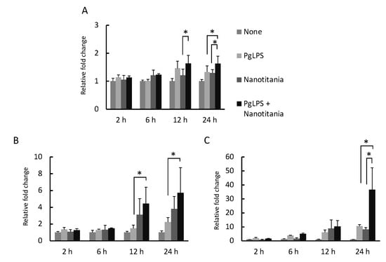 Expression levels of IL-1β (A), IL-6 (B) and IL-8 (C) mRNA were measured by qPCR after incubation with 10 µg/mL PgLPS, 10 µg/mL nanotitania and both stimulants together. Each data point indicates the average of six gene expression quantification results (n = 6). Bars indicate standard deviation, and asterisks indicate p < 0.05.