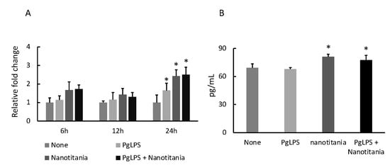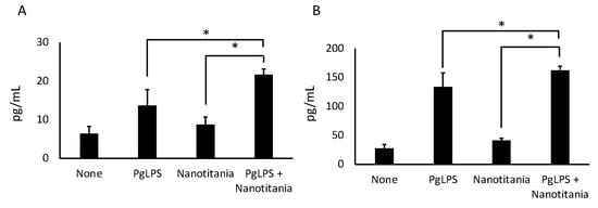 Protein levels of IL-6 (A) and IL-8 (B) were measured by ELISA after incubation with 10 µg/mL PgLPS, 10 µg/mL nanotitania and both stimulants together. Each data point indicates the average of six gene expression quantification results (n = 6). Bars indicate standard deviation, and asterisks indicate p < 0.05.
