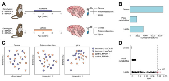 (A) Schema of experimental design. (B) Number of quantified genes, polar metabolites, and lipids. (C) Multi-dimensional scaling plots visualizing variation among samples calculated based on abundance levels of 8871 genes, 1829 polar metabolites, and 3608 lipids. Colors correspond to treatment status, shapes to the MAOA genotype. (D) Distribution of t-test FDR values calculated for 8871 genes, 1829 polar metabolites, and 3608 lipids in the comparison between treated and control animals. Dashed line corresponds to FDR cutoff of 10%. The number of lipids passing this FDR cutoff (red) is marked on the right. The identified number of lipids passing the cutoff is greater than expected by chance (permutations, p = 0.008).