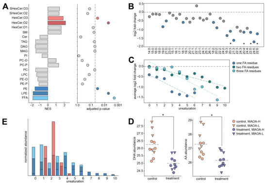 (A) Lipid class enrichment analysis results based on the comparison between treated and control animals. Left: normalized enrichment scores (NES). Positive NES corresponds to an increase in the lipid abundances in treated animals, and negative NES corresponds to decrease. Colors mark lipid classes demonstrating significant enrichment in the treatment-control differences. Right: adjusted enrichment p-values. The dashed line corresponds to the adjusted p-value cutoff of 0.05. (B) Base two log-transformed fold change (log2 FC) values calculated between treated and control animals for lipids in free fatty acid (FFA) class. X-axis labels indicate fatty acid chain length and number of double bonds. FFAs are ordered by increasing unsaturation. Blue symbols mark compounds with nominal t-test p < 0.05. Asterisks mark statistically significant compounds (t-test; FDR = 10%, permutations p = 0.0008). The dashed line indicates log2 FC = 0. (C) Log2 FC values calculated between treated and control animals, averaged for all the lipids with the same level of unsaturation (number of double bonds). Lipids were first separated into groups based on the number of fatty acid residues, one (dark blue), two (green), or three (light blue), and sphingolipids were excluded. The black dashed line indicates log2 FC = 0. Colored dashed lines indicate linear regression lines fitted to each group (p = 0.0054, 0.54 × 10−5 and 0.00022 for lipid classes containing one, two and three fatty acid residues, respectively). (D) Abundance levels of docosahexaenoic acid (DHA) and arachidonic acid (AA) in treated and control animals. Symbols represent individual samples. Colors correspond to treatment status, shapes to the MAOA genotype. Asterisks mark statistically significant differences between treatment and control (t-test; FDR = 10%, permutations p = 0.0008). (E) The cumulative abundances of lipids contained in FFA, LPE, PE, HexCer;O2, and HexCer;O3 lipid classes (colors as in panel A) for each level of unsaturation (number of double bonds per compound). Cumulative abundances were normalized between the lipid classes.