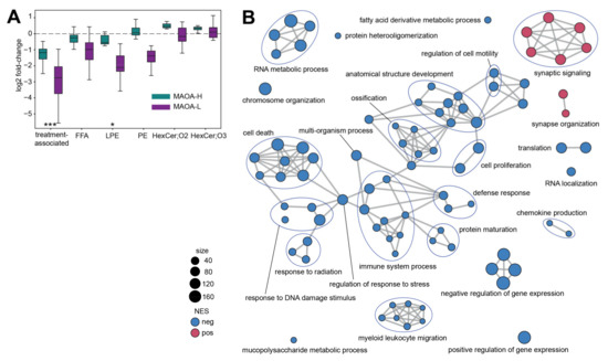 (A) Base two log-transformed fold-change (log2 FC) values calculated between treated and control animals carrying MAOA-H (green) and MAOA-L (purple) genotype. X-axis labels indicate lipids used in the comparison: 106 treatment-associated lipids and lipids contained in treatment-affected lipid classes: FFA, LPE, PE, HexCer;O2, and HexCer;O3. Boxes show median log2 FC values and interquartile interval. Error bars extend according to Tukey’s original boxplot definition. Asterisks indicate enrichment in lipids showing treatment-by-MAOA genotype interaction (hypergeometric test, *** p < 0.001, * p < 0.05). (B) Gene ontology (GO) terms enriched in gene expression differences between treated and control animals (GSEA, adjusted p < 0.05). One point indicates one GO term. Colors show negative (blue) and positive (red) normalized enrichment score values, which correspond to the dominant direction of expression change between treated and control animals within the GO term. Symbol size is proportional to the number of genes in the GO term. Edges connect functionally related GO terms.