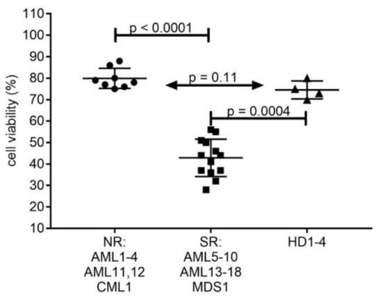 Mononuclear cells of AML patients diagnosed and treated at the University Hospital, Bern, Switzerland, between 2005 and 2018 were included in this study. Informed consent from all patients was obtained according to the Declaration of Helsinki, and the studies were approved by decisions of the local ethics committee of Bern, Switzerland. Peripheral blood mononuclear cells (PBMCs) and bone marrow mononuclear cells (BMMCs) were collected at the time of diagnosis before initiation of treatment. The AML cells were analyzed at the central hematology laboratory of the University Hospital Bern according to state-of-the-art techniques []. Mutational screening for FLT3, NPM1, TP53, and conventional karyotype analysis of at least 20 metaphases were performed in all samples. In addition, all samples were analyzed by NGS sequencing of the myeloid panel genes.